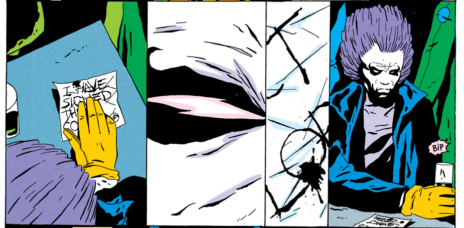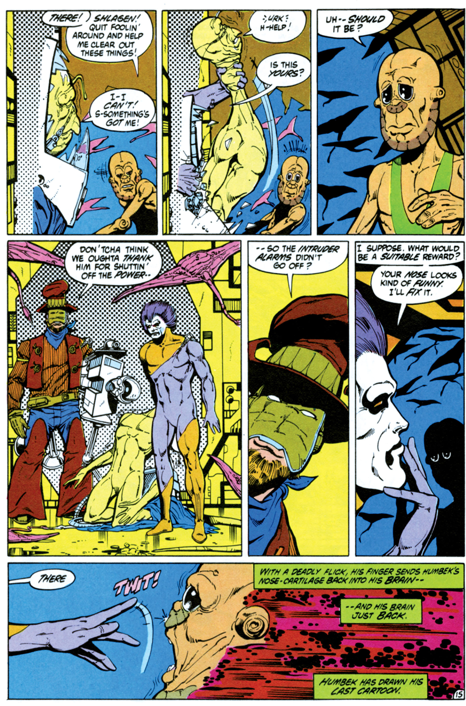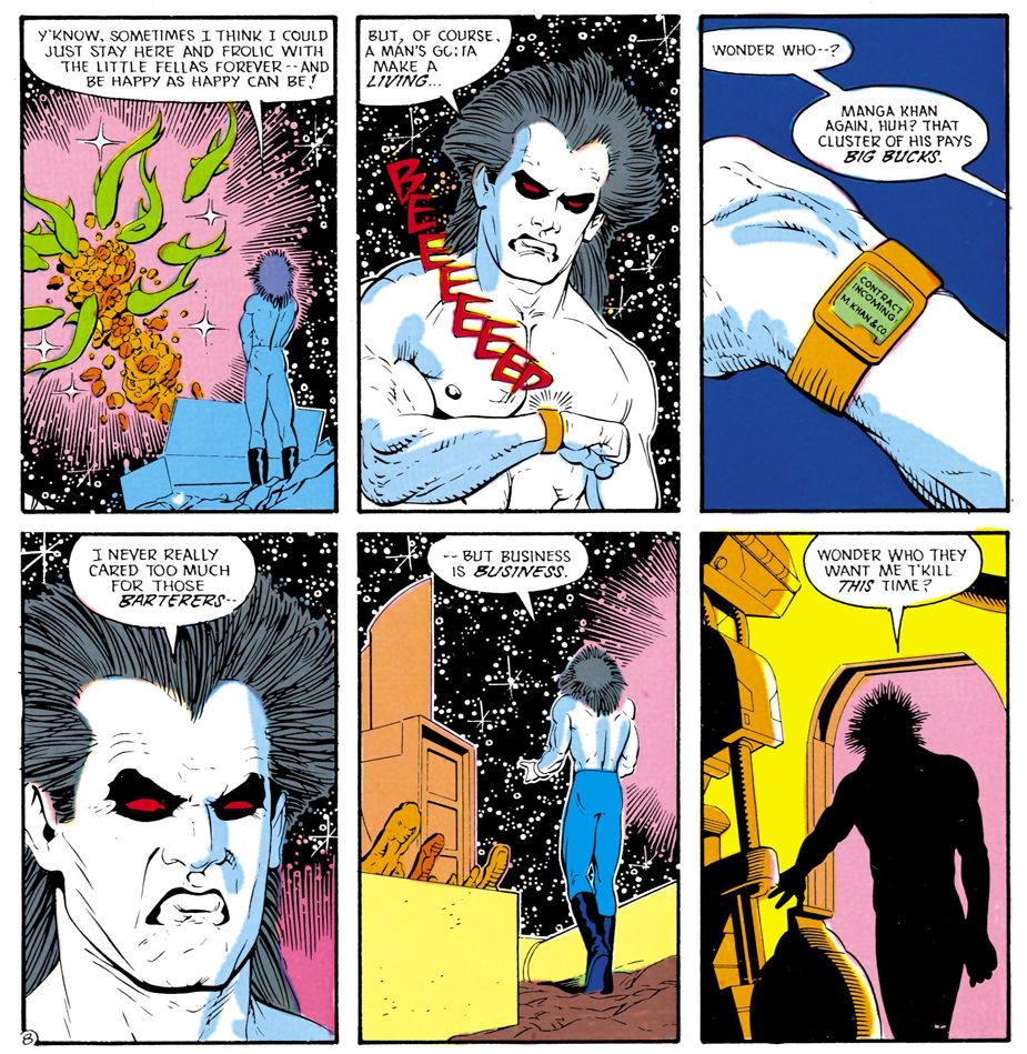 Lobo turned up a few more times in Omega Men. In #37, back in 1986, he was hired to kill his own ex-partner Bedlam, seen above, who'd been incarcerated for his crimes. Lobo broke into the prison and fulfilled that contract without hesitation, but he seemed a bit disturbed afterward when he learned Bedlam had signed the contract himself.