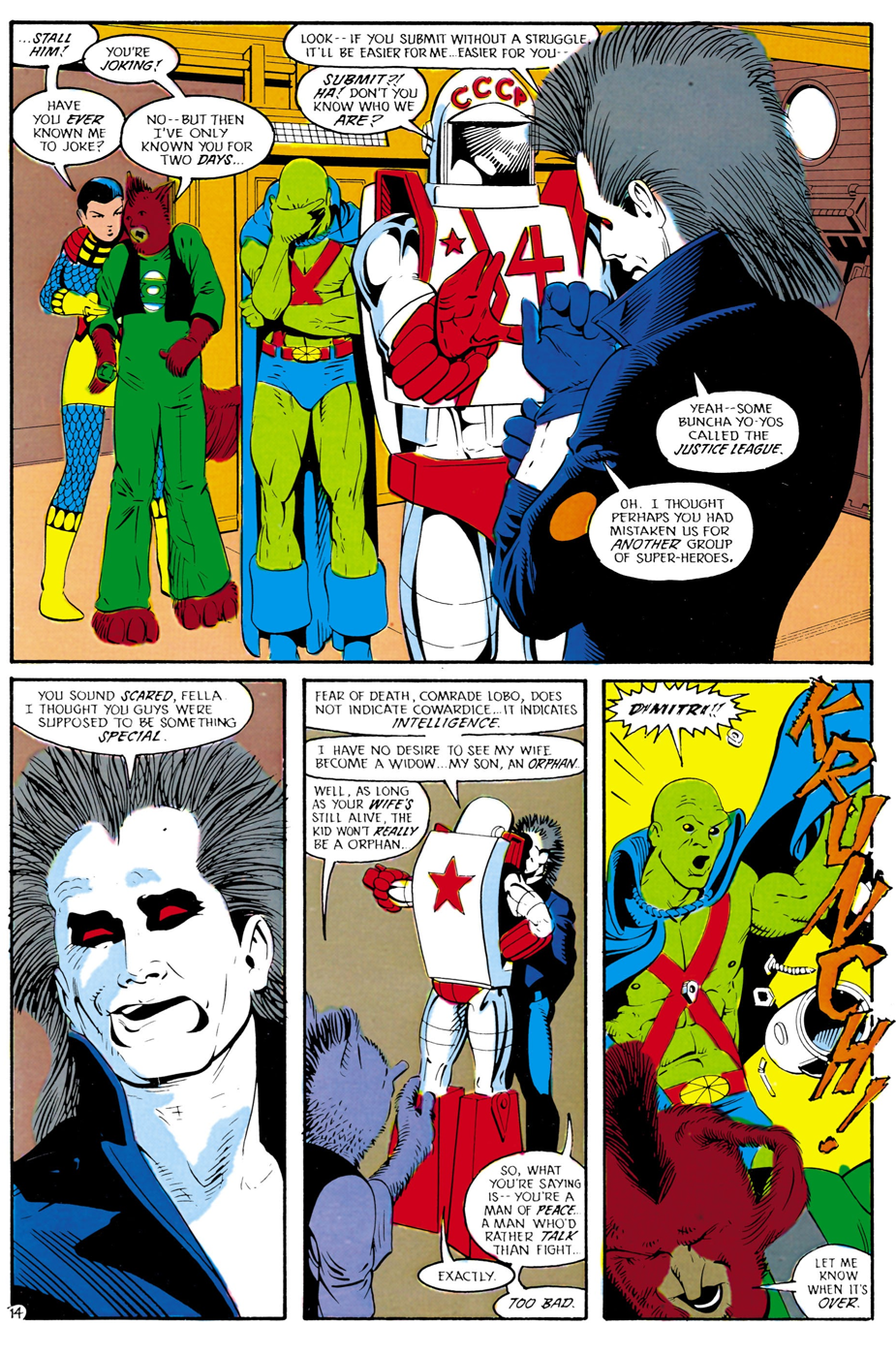 Justice League International #18, on top of its usual 22 pages by its usual creative team, has a 16-page bonus feature by Mark Askwith and James/Jim Webb.. That feature is just fine, but I’m going to blow through it quick so we can devote more time and page space to Lobo.