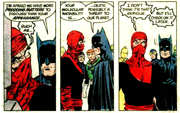 As you can imagine, Batman's not going to let it lie there. But the Weird can fly, is selectively intangible, and can manipulate various forms of energy, making him just about uncatchable. He knocks out most of the Leaguers and slips away to deal with personal business.