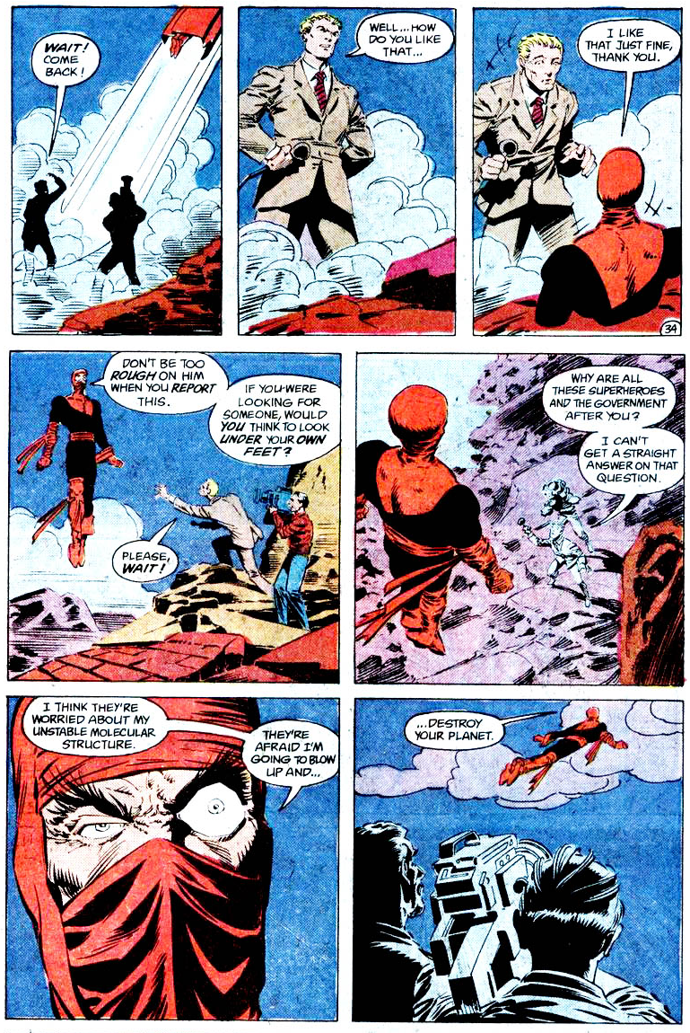 The Weird launches into a rambling origin that boils down to this: there are two kinds of energy beings in his dimension. Macrolatts prey on the helpless zorolatts, and what's more, they're real dicks about it. The Weird is a zorolatt, but on our world, he has more power and hope. “You have something on this world you call freedom…I desired freedom.” “The Jason” (just a guy named Jason) wants to open the way for the macrolatts to invade Earth. The macrolatts are all about that, but showing his unusual initiative, the Weird got here first.