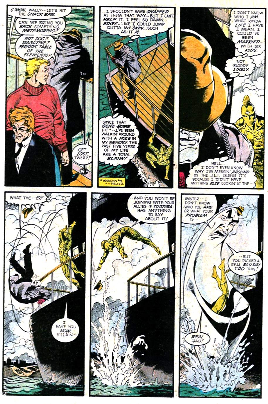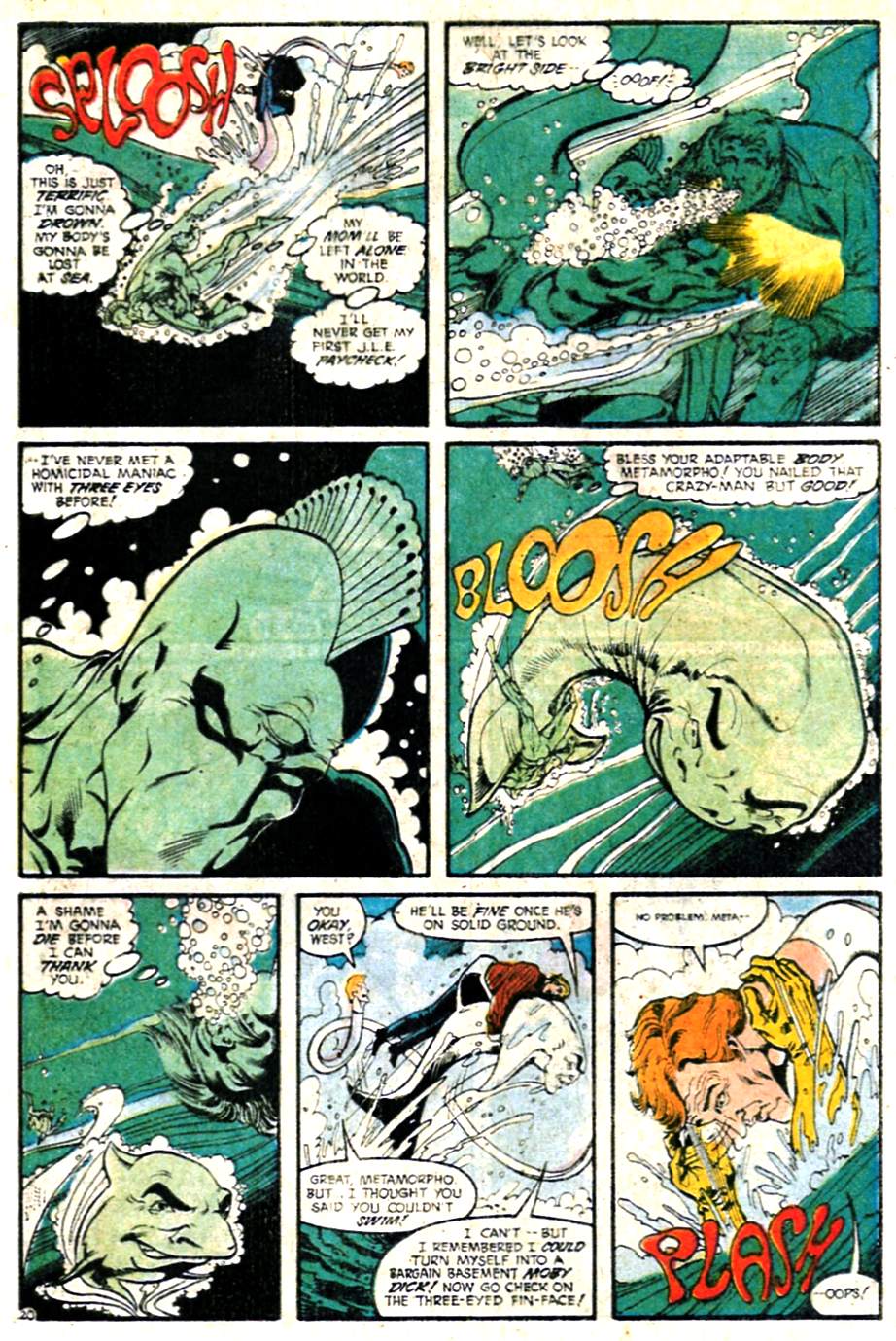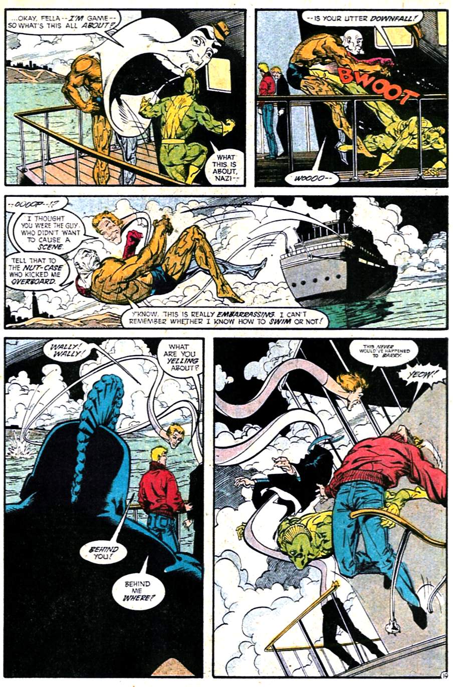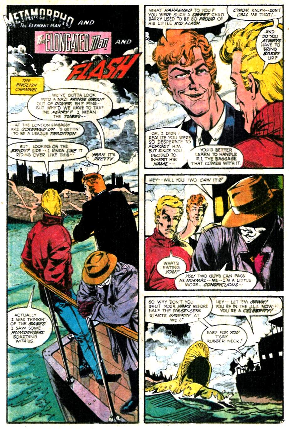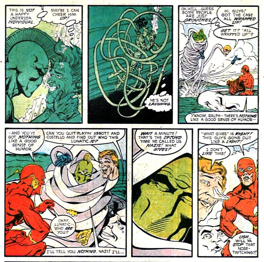 Flash, Metamorpho, and the Elongated Man go up against the water-breathing Tuatara. Seems like that’d be the most lopsided of the fights, but Tuatara really earns his paycheck here. I’m focusing on this one, as it has the most interesting interpersonal dynamics. Try to ignore Wally’s blond “dye job,” it’ll be gone in a couple more issues.