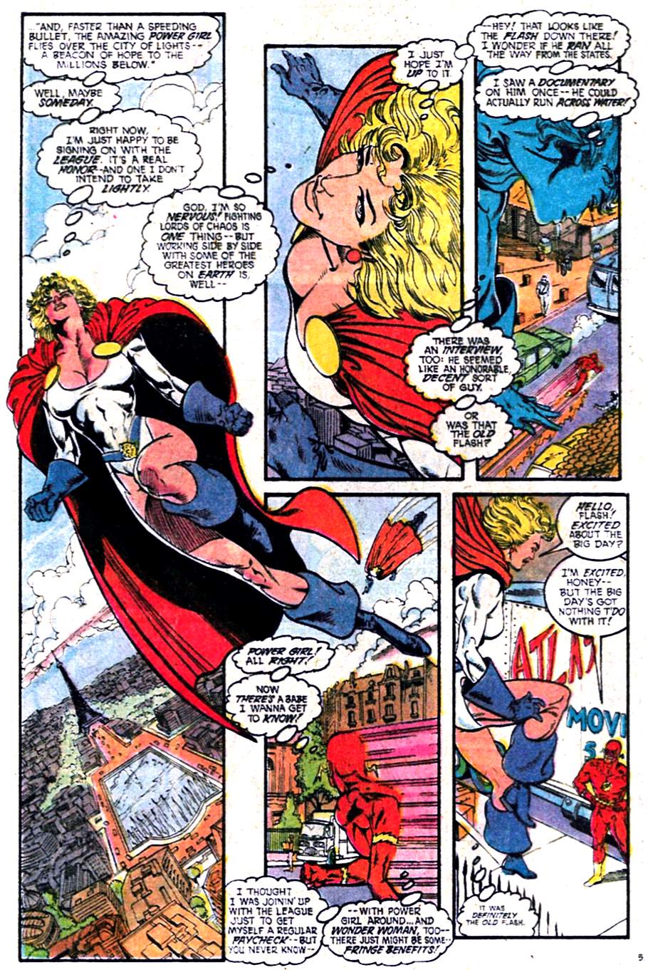 Next come Power Girl and the Flash, neither of whom are quite the characters you probably remember. PG was going through her first major rebrand: for a hot minute, she was the granddaughter of an Atlantean sorcerer and super into fighting the Lords of Chaos. And during his pre-Linda days as the Flash, Wally West was kind of…uh…problematic?