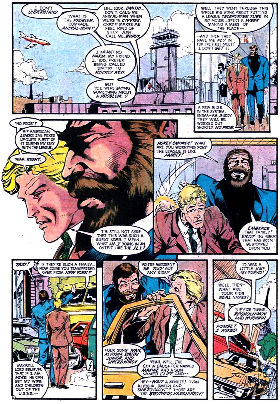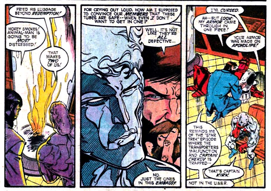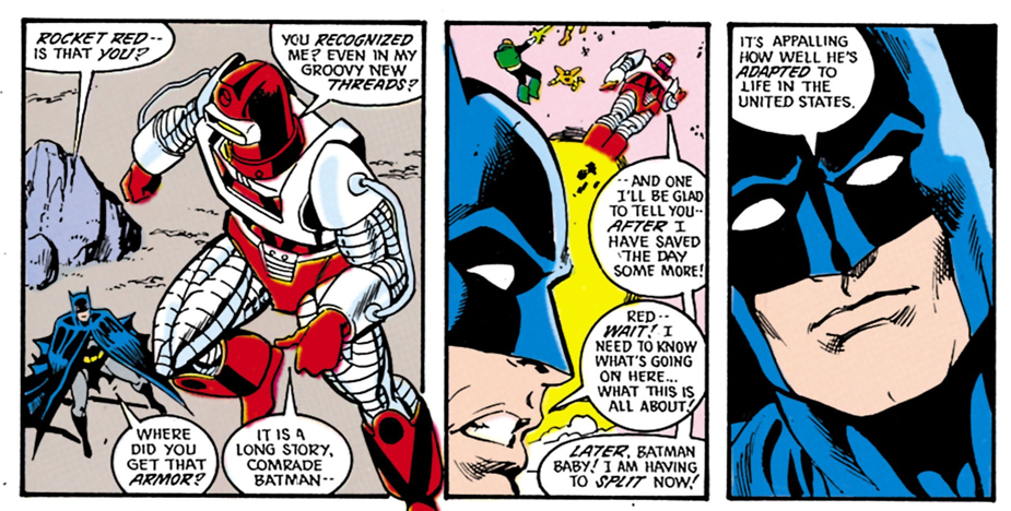 Next, Animal Man and Rocket Red. Points if you get the last panel’s double literary reference.