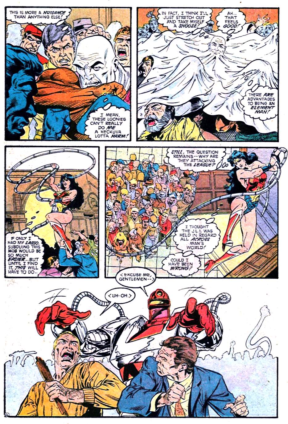 As issue #2 begins, Wonder Woman abandons the group to get high with Dionysus in a French McDonald’s. Just kidding, but seriously, she vanishes from the narrative without a word of explanation and never returns during the Giffen-DeMatteis era. (In JLE #21, Catherine would say only, “She never even bothered to tell us she was no longer interested in participating.”)