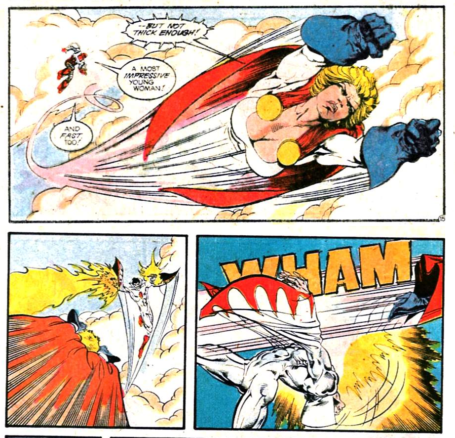 Next comes Power Girl and Rocket Red vs. Rising Sun. Rising Sun’s easily the most powerful of the issue’s opponents, but Power Girl has “power” right there in her name, so…it’s like going up against the Unbeatable Squirrel Girl. You’re defeated by branding before you start.