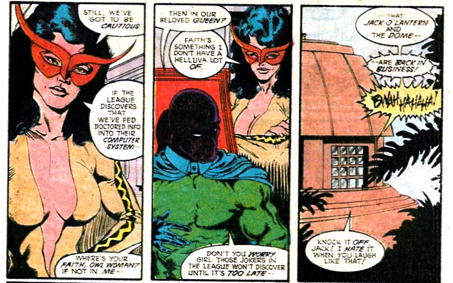 While Diana’s enthusiasm is cooling fast in JLE #1, her unexplained departure doesn’t feel like a storyteller’s decision. I’d guess it was editors Karen Berger and/or Andy Helfer who pulled the plug, after it became apparent that Perez, Giffen, and DeMatteis’ ideas weren’t gelling. Given what the DC offices of the Eighties were like, Berger may’ve felt that Wonder Woman getting hit on every four minutes was a little too close to home.