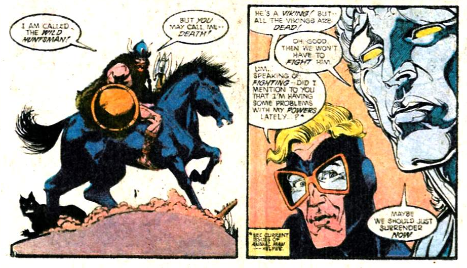 The remaining team splits into groups of two and three to investigate locations their computer system points to as possible Nazi fringe groups with metahuman activity. Each subgroup runs into an ex-member of the Global Guardians. First, it’s Cap and Animal Man vs. the Wild Huntsman.
