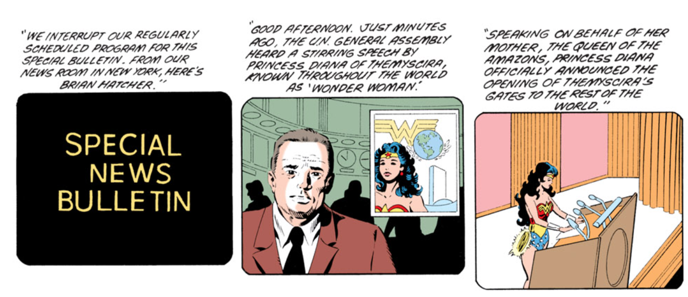 Diana sought peaceful resolutions more than the average superhero, which made her a challenge for others to write in general. (Animal Man would develop a similar hang-up, a year or so later.) Her fish-out-of-water nature made it difficult to write comedy around her--at least comedy that wasn’t kinda "ha-ha, isn't that cute, she thinks she's assimilated!" And Rocket Red already had that niche locked down.