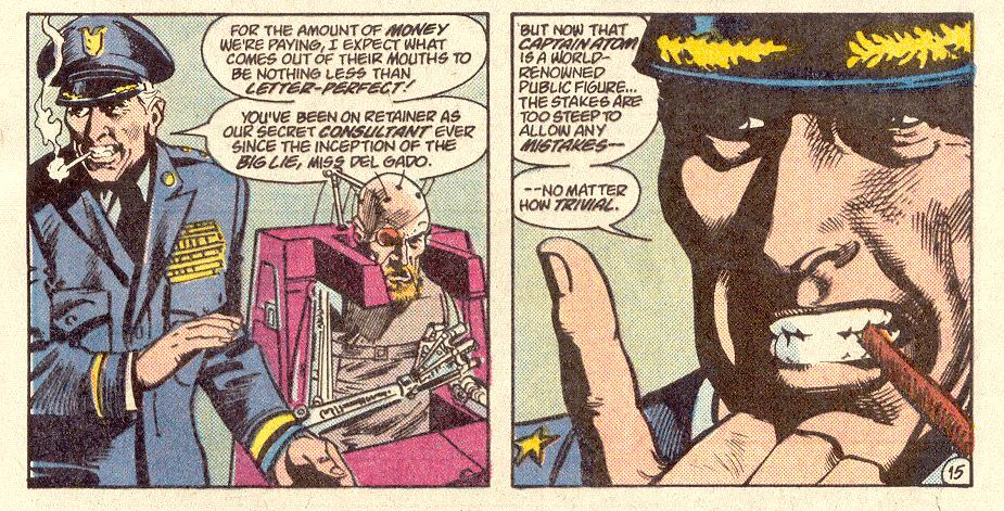 And here’s Captain Atom and Catherine Cobert. Cobert first appeared in Justice League #8 and, up to this point, hadn’t been developed much past “competent professional” and “stunningly beautiful.” She says she’s nervous about this transition but doesn’t really look it. She might be just saying that to ease the pressure on the flop-sweating Captain Atom.