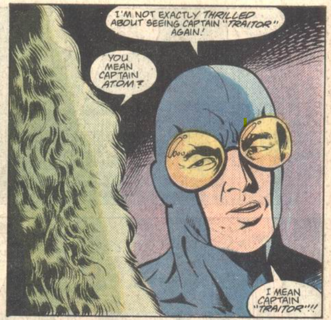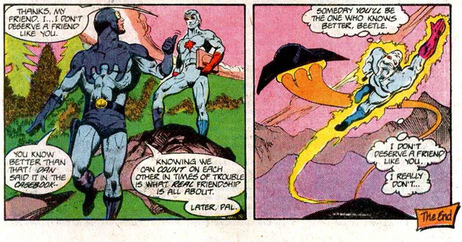 This matters to Cap, but also to Beetle, whose predecessor had been Captain Atom’s “friend” in his false history. Meaning their present-day relationship was founded on that lie (Captain Atom #20):