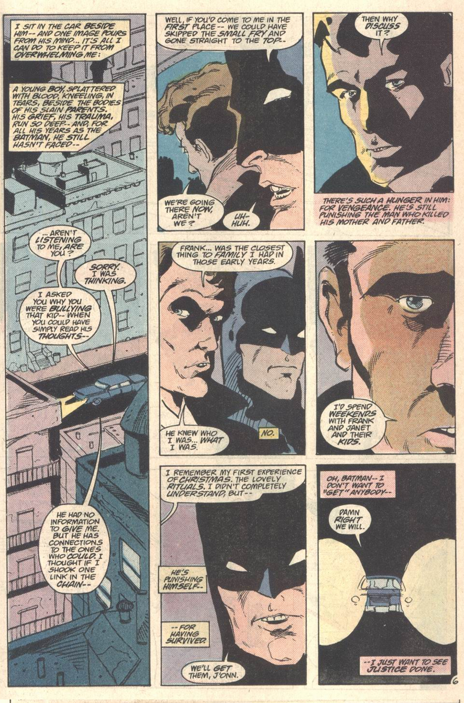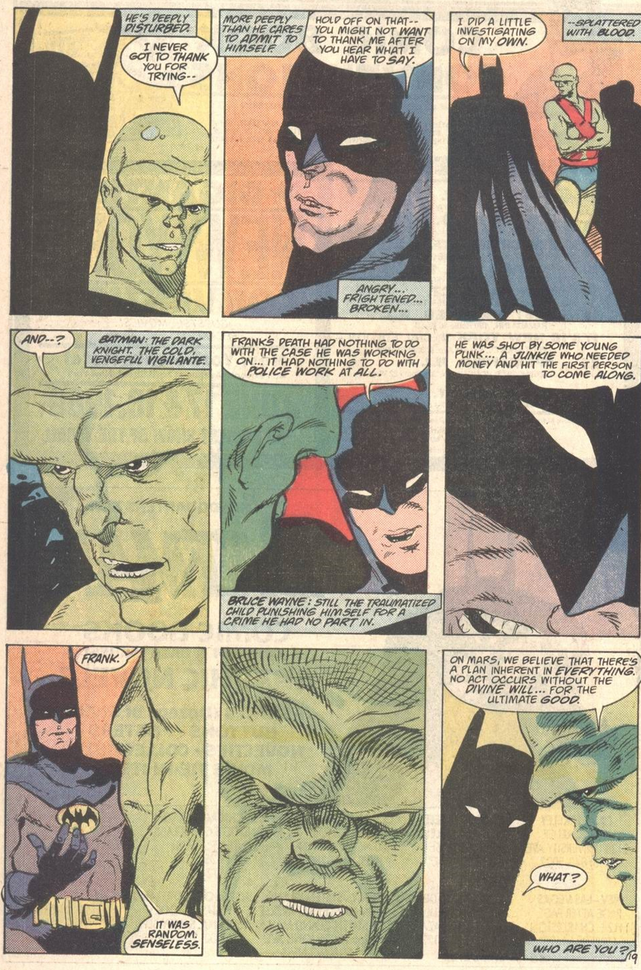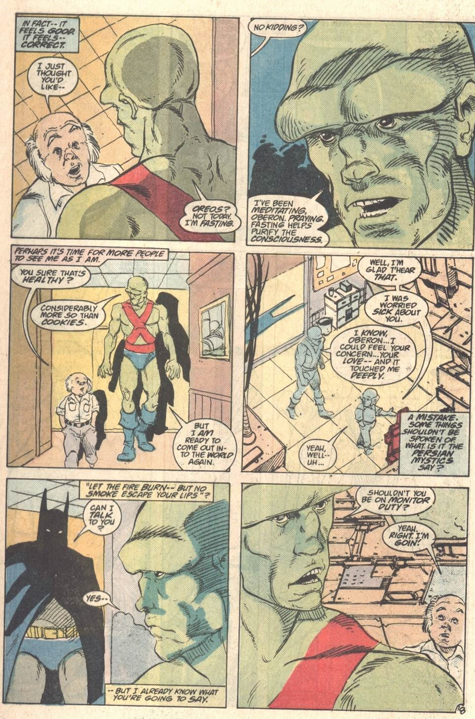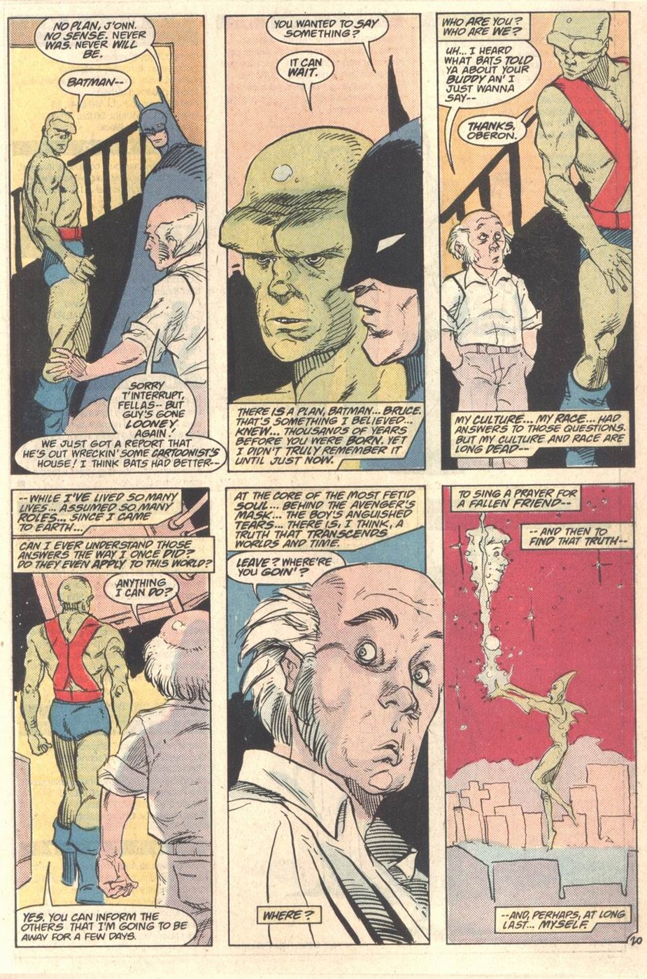 The backup feature revolves around J’Onn investigating the death of Frank, his cop buddy from Secret Origins #34. Although Giffen handles the plot and breakdowns as usual, this feels like more of a DeMatteis story, full of his conflicted thoughts about violence and traditional superheroics. Art is by Tim Gula, who’s better known for animation storyboarding, but whose expressionist style picks up where the Martian Manhunter miniseries left off.