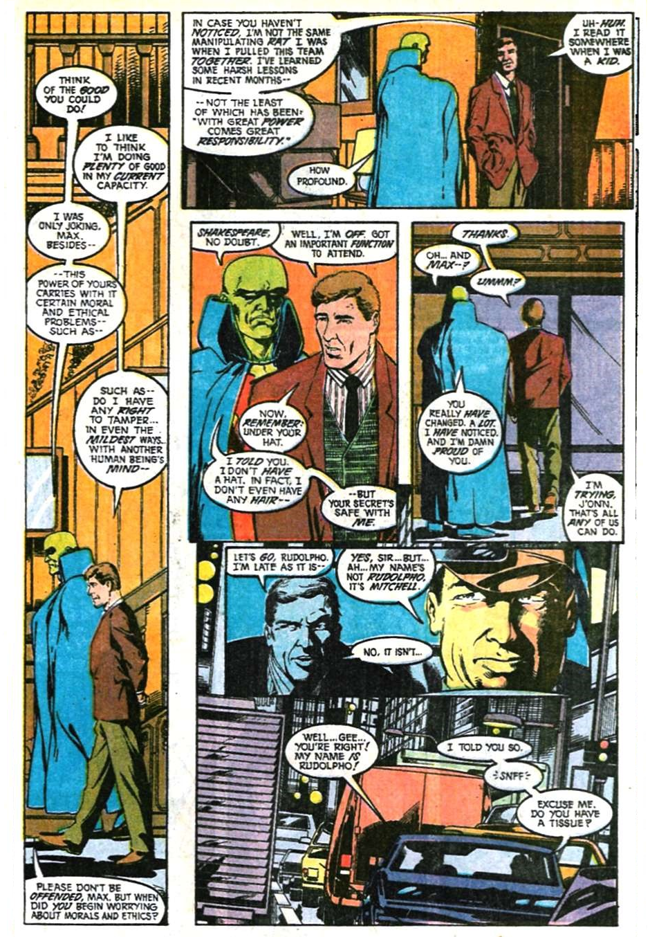We begin with Max confessing and demonstrating his power to J’Onn. Even Martian mental strength is no shield against it. Max implants a small illusion in J’Onn’s mind, though J’Onn soon realizes it wasn’t real. J’Onn suggests that this makes Max “something of a super-hero. I can see it now! We’ll get Fire to design you a garish costume…”