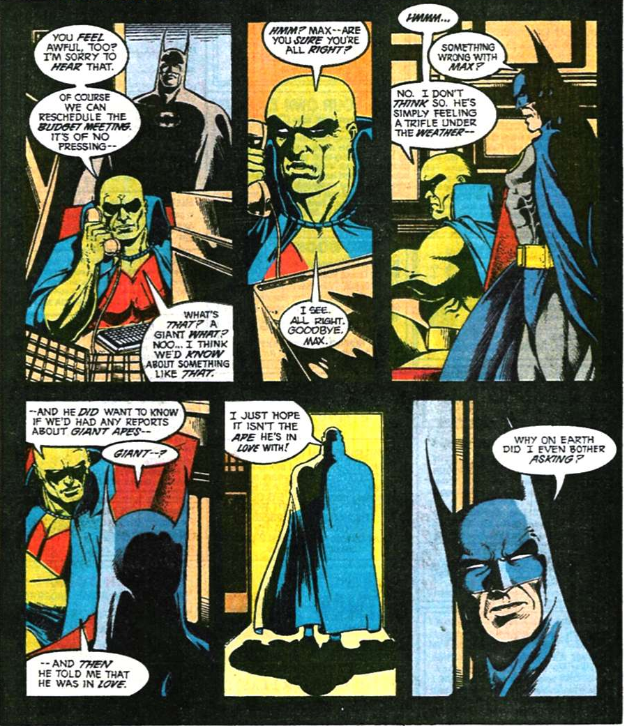 The narrative gets more disjointed as it goes. Max shoos King Kong off the Empire State Building, sending him plummeting ninety stories. Then suddenly it’s time for a League meeting, even though it was the middle of the night a moment ago and Max told Wanda he’d be back in an hour.