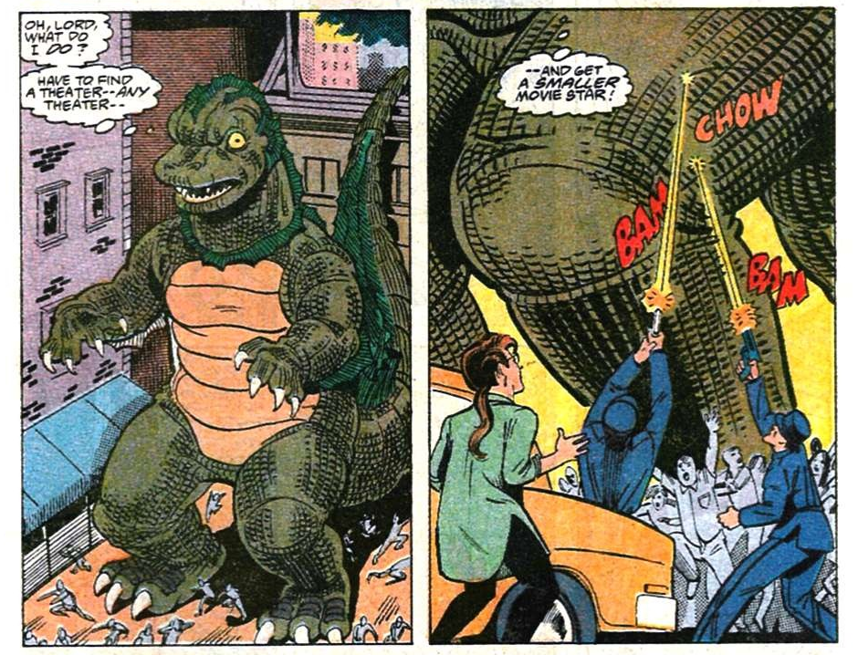 Captured by the police and on his way to jail, the impersonator has one escape option: an advertising screen on top of a theater is showing clips from Godzilla. “Flint Clintwood” vanishes, and is replaced by…