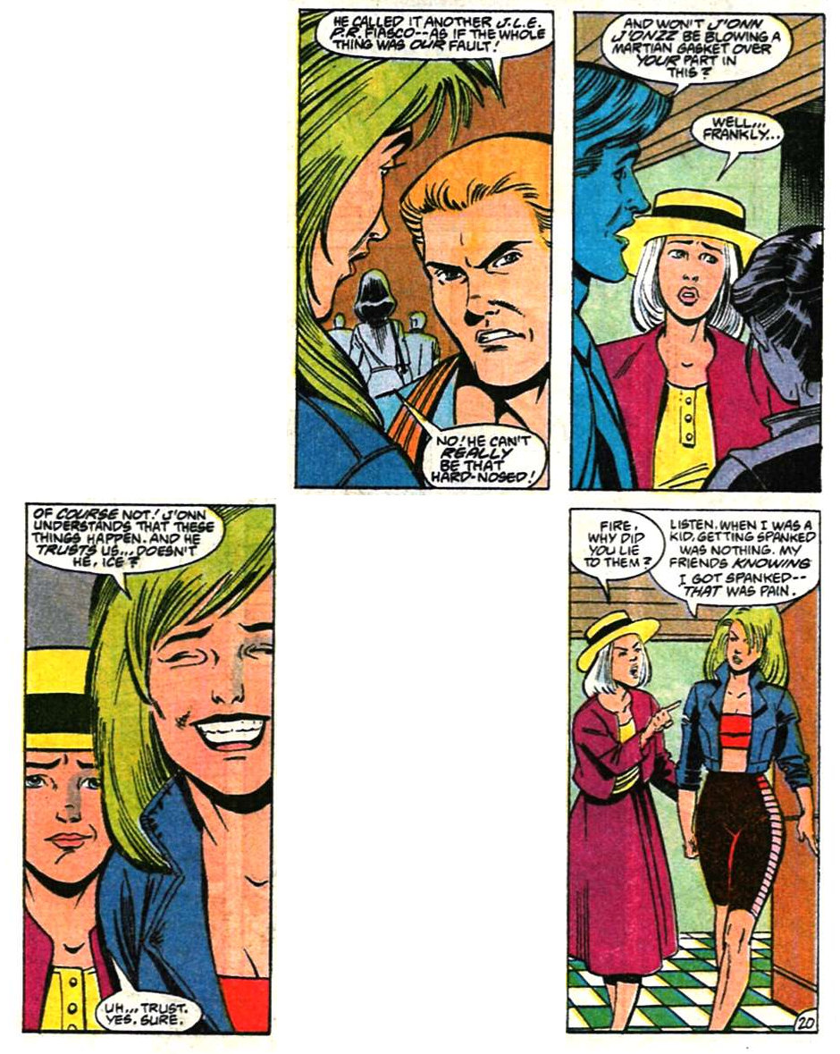 (It looks like Fire and Ice have their older costumes in the Mike McKone art and colorist Gene D’Angelo tried to “fix” them by coloring them as their then-current versions. Kinda works for Ice but not for Fire.)