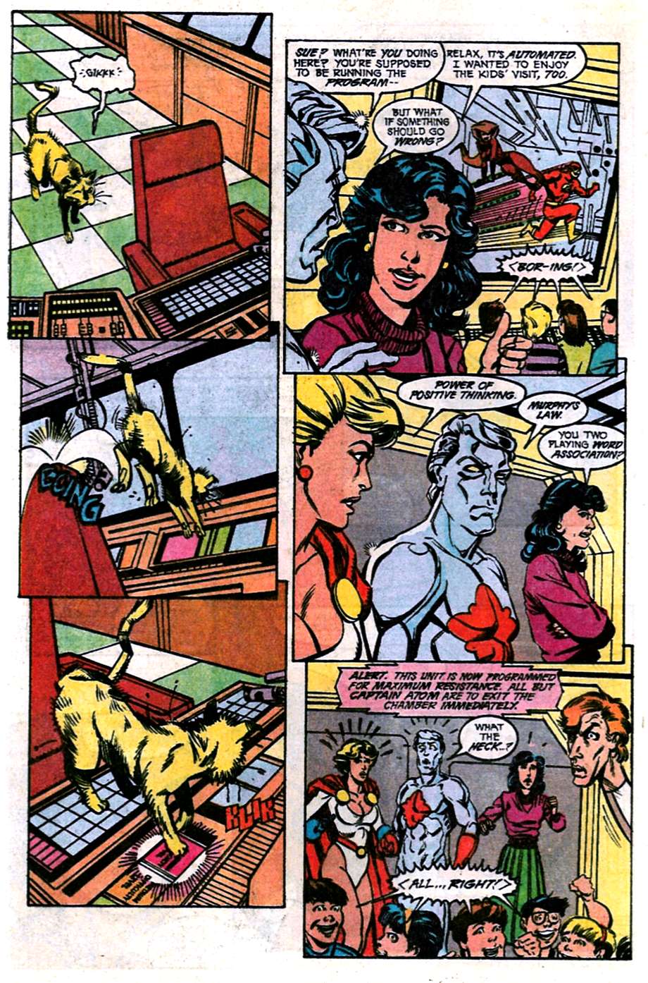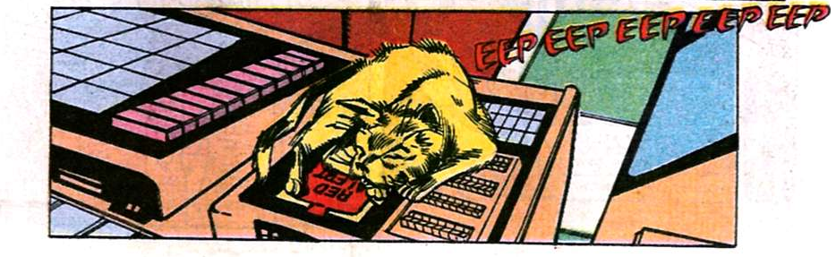 “I’d ask what that [crashing and banging] is,” says Captain Atom downstairs, “but I’m afraid someone will tell me.” Atom runs up as the cat flees Guy, said cat trips Captain Atom, who pratfalls back down the stairs just in time for the doors to burst open…