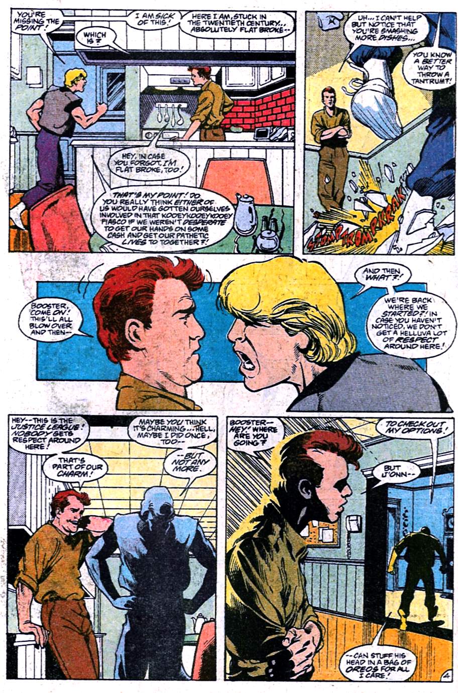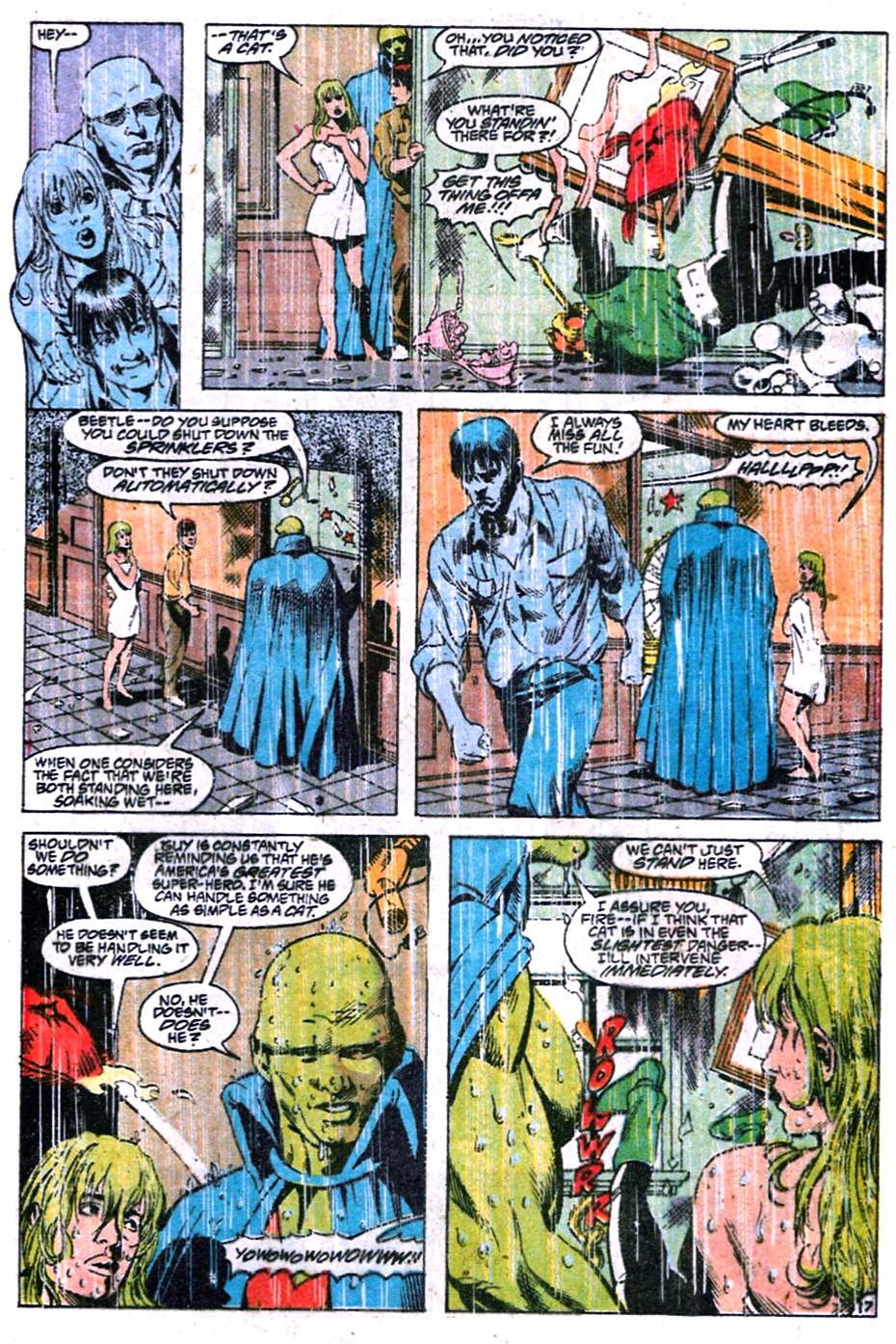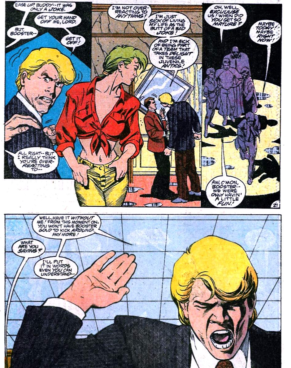 Yep, Beetle and Booster are still working off their bad behavior as the embassy’s live-in maids. Both have accepted that punishment for a while, but it’s been two weeks, and tempers are fraying. Booster drops one dish in carelessness, then after some back-and-forth with Beetle and J’Onn, he drops another in anger.