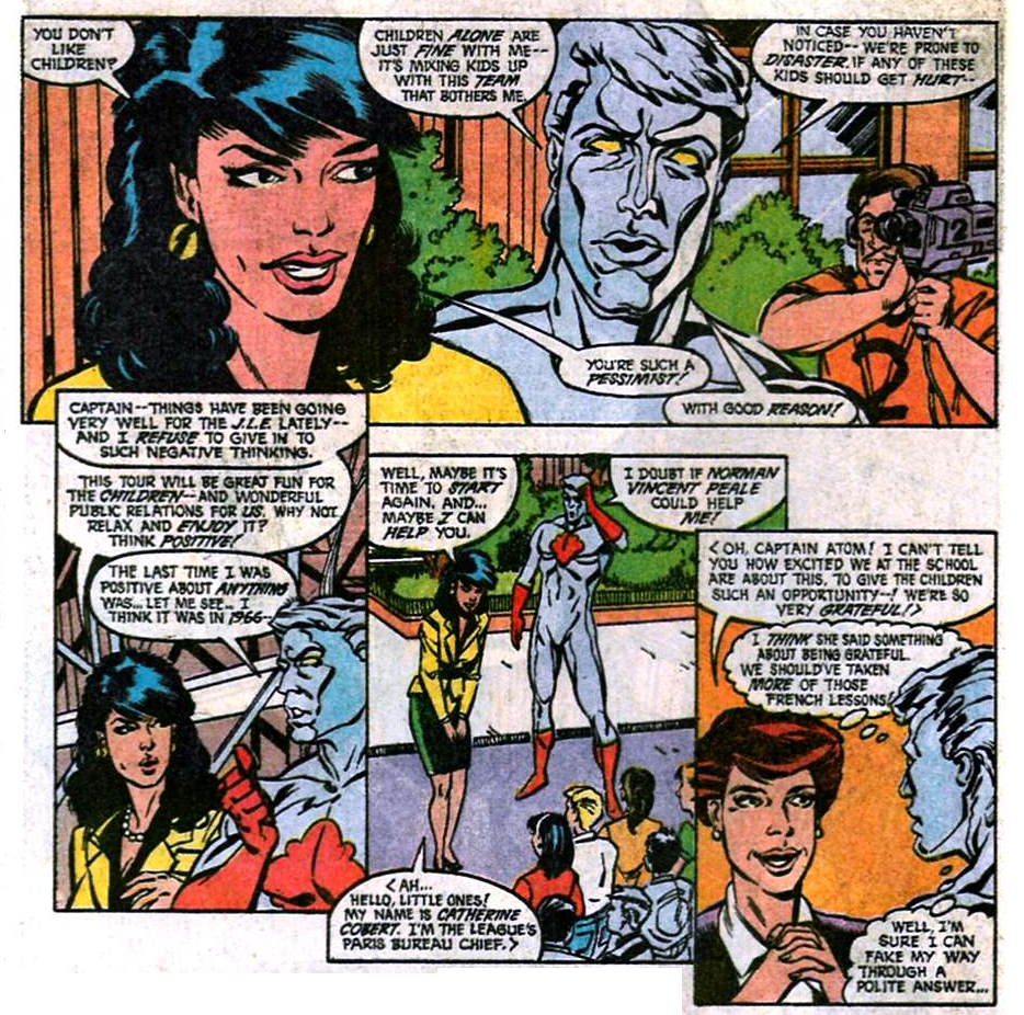 The issue starts with Catherine inviting a bunch of French children to tour JLE headquarters. Hey, it’s not like they can take a field trip to the Dome, right? (Because it’s a vaporized ruin and the JLE took the blame LOL)