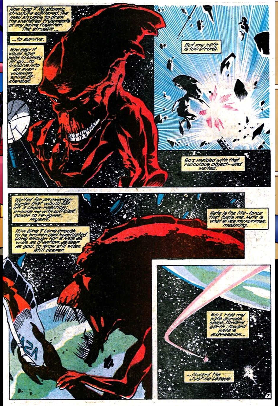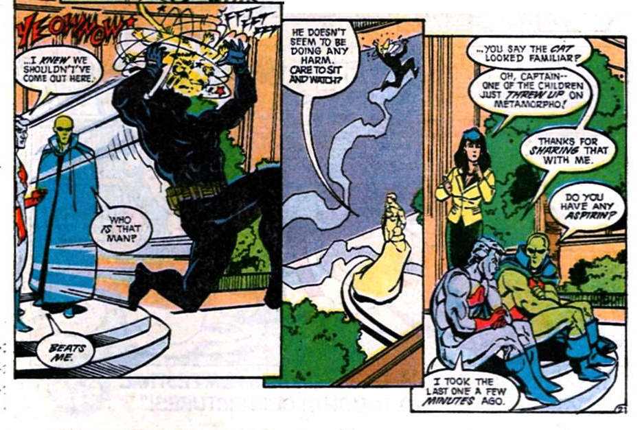 In JLA #37 (Giffen/DeMatteis/Hughes), he finishes pulling himself back together into a transitional form, by focusing on what’s really important in life. Well, what he considers important, anyway.