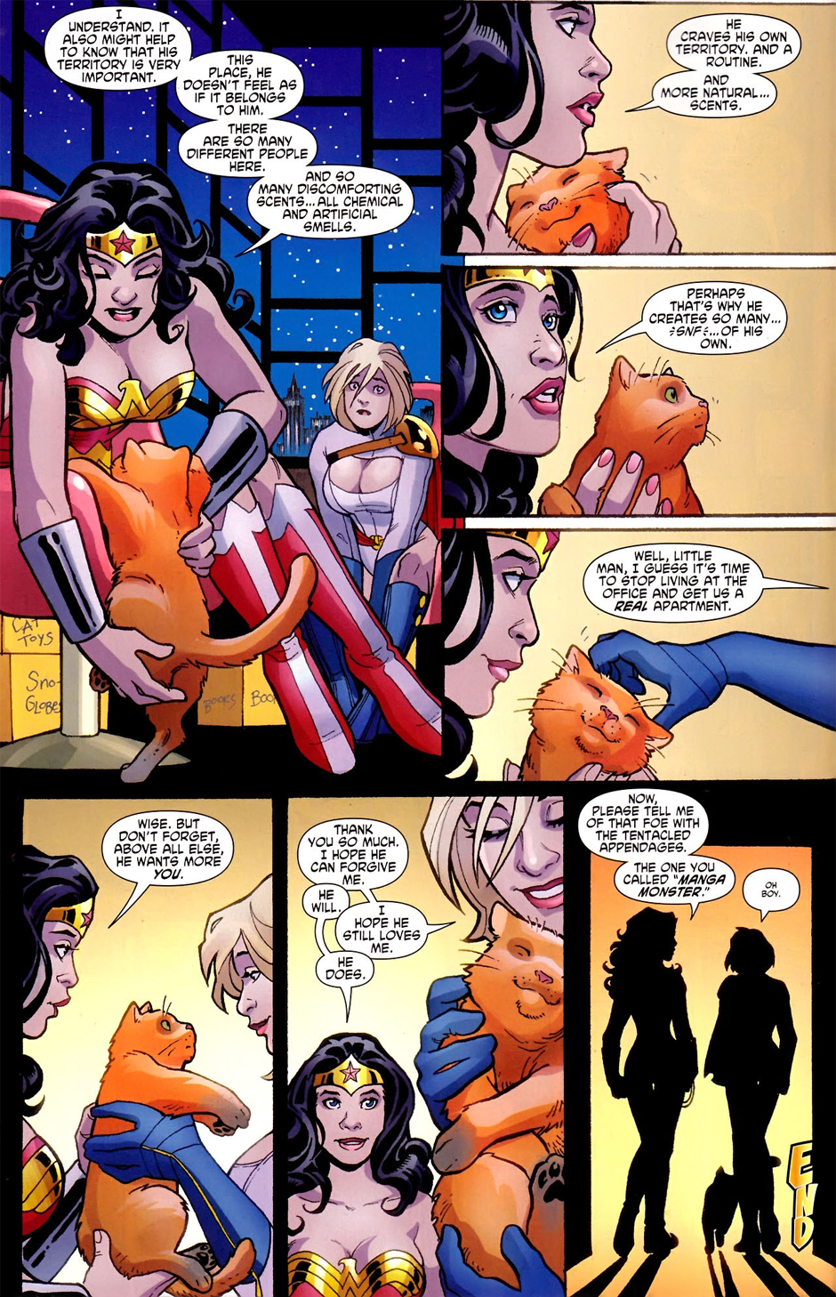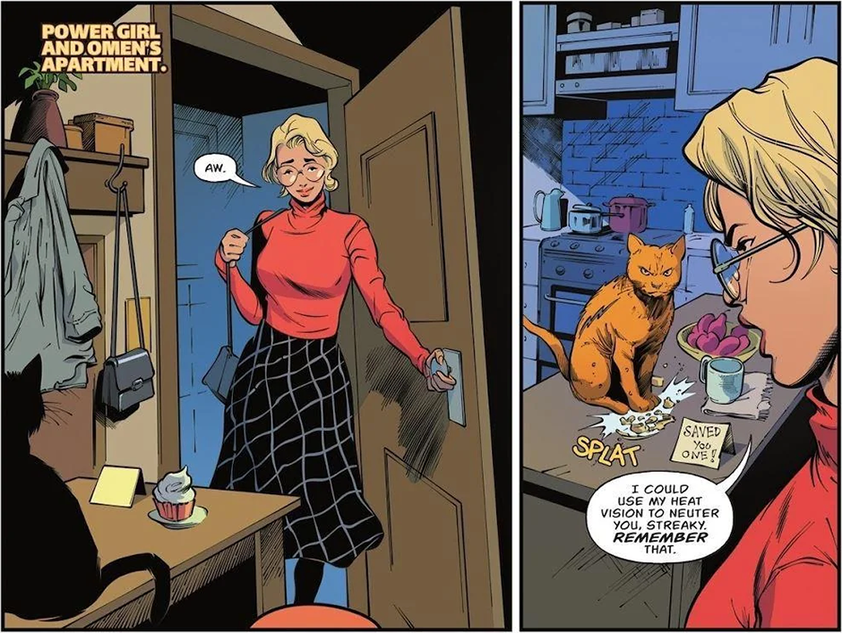 The Cat (occasionally named Stinky) would continue to associate with Power Girl for a while in this and other titles. Later incarnations would be more pleasant in appearance, though as odiferous as ever.