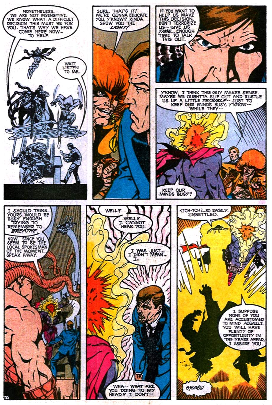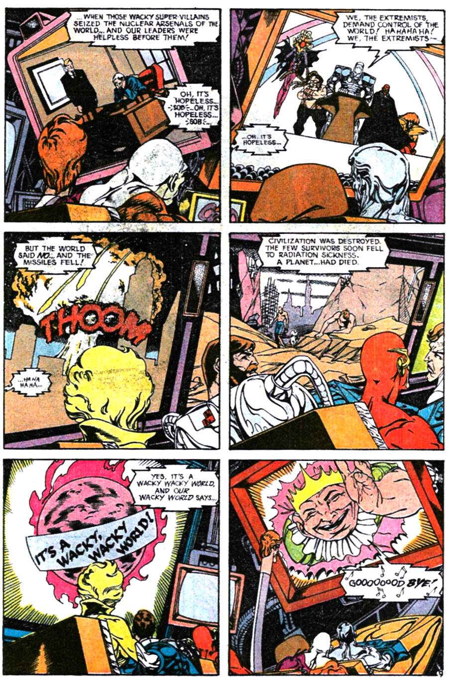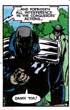 The UN decides on appeasement: nobody is allowed to provoke the Extremists, least of all super-heroes. Various heroes from Superman to the Peacemaker are shown reflecting on how helpless they are.