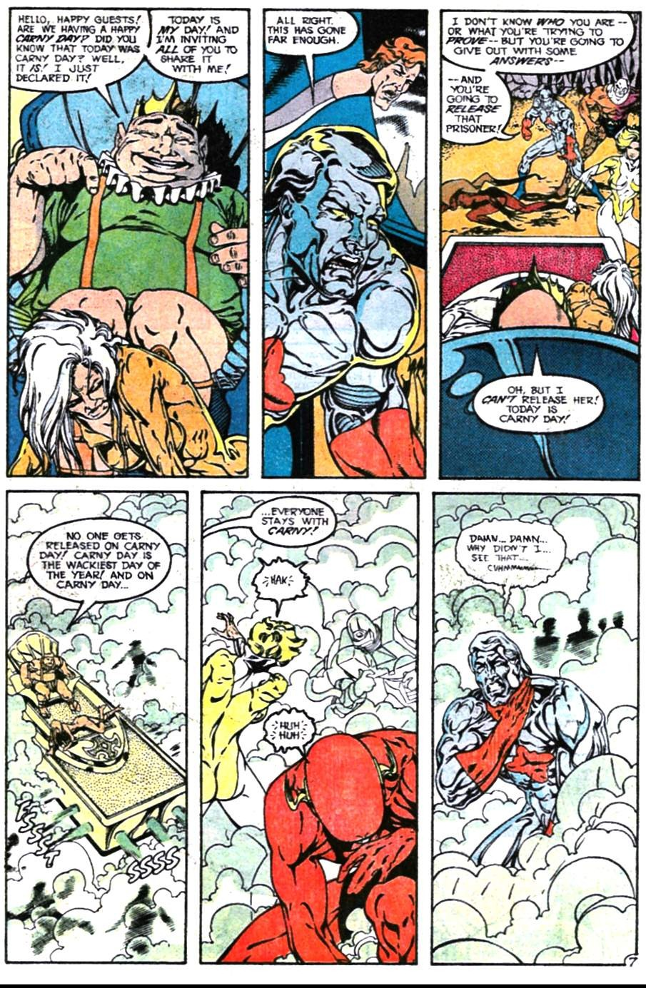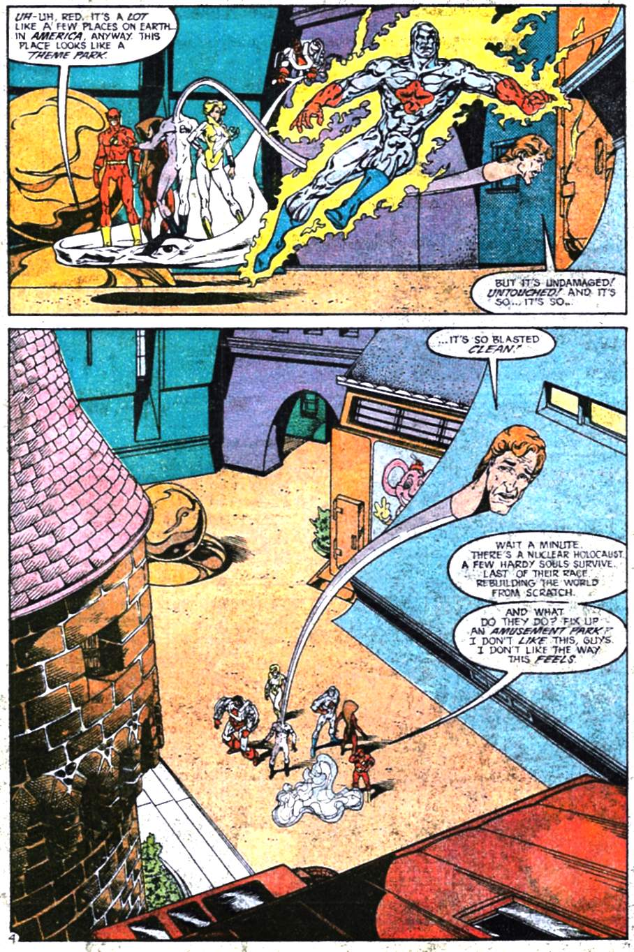 The JLE find themselves on the Extremists’ postapocalyptic world. Some holographic advertising directs them to a place Rocket Red describes as “like nothing on Earth.”