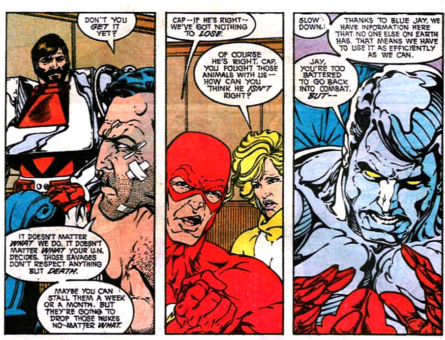 The Extremists berating the JLE is hilarious, but also a little confusing. Both Bluejay and Lord Havok himself have presented the Extremists as, well, extreme enough to end the world on a whim. Yet here they are, acting terrified of the nukes and furious with the JLE for their carelessness. What’s going on here? Answers are coming…but not just yet.