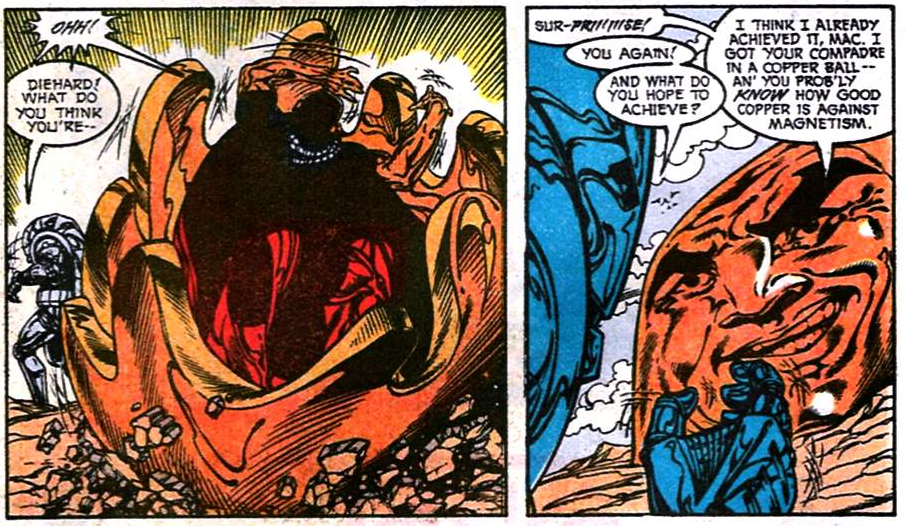 It’s unclear whether Max is trying to use his power on Tracer…doing so would risk exposing that power to the UN, but he might take a stab at it, given the stakes. His nose is bleeding in panel 6, so maybe he tried, Dreamslayer sensed it, and Dreamslayer decided to show Max what real mind-manipulation felt like. That could be Dreamslayer’s idea of a joke. Or maybe Max didn’t try, and the nosebleed is just because of what D’s doing to him. Works either way.