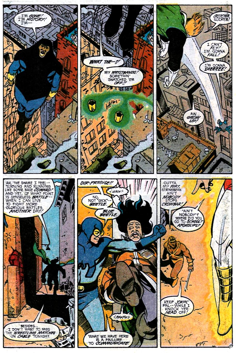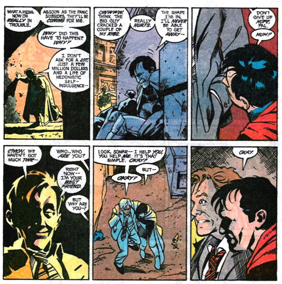 J'Onn himself takes out Sonar, grabbing his tuning-fork gun while invisible. When we next see Sonar/Bito in post-Giffen JLI comics, he will have a completely different personality, somewhere between Doctor Doom and Phantom of the Opera. Or, if you prefer, he will be doing his best to pretend that this whole phase of his life never happened (Justice League Europe #48).