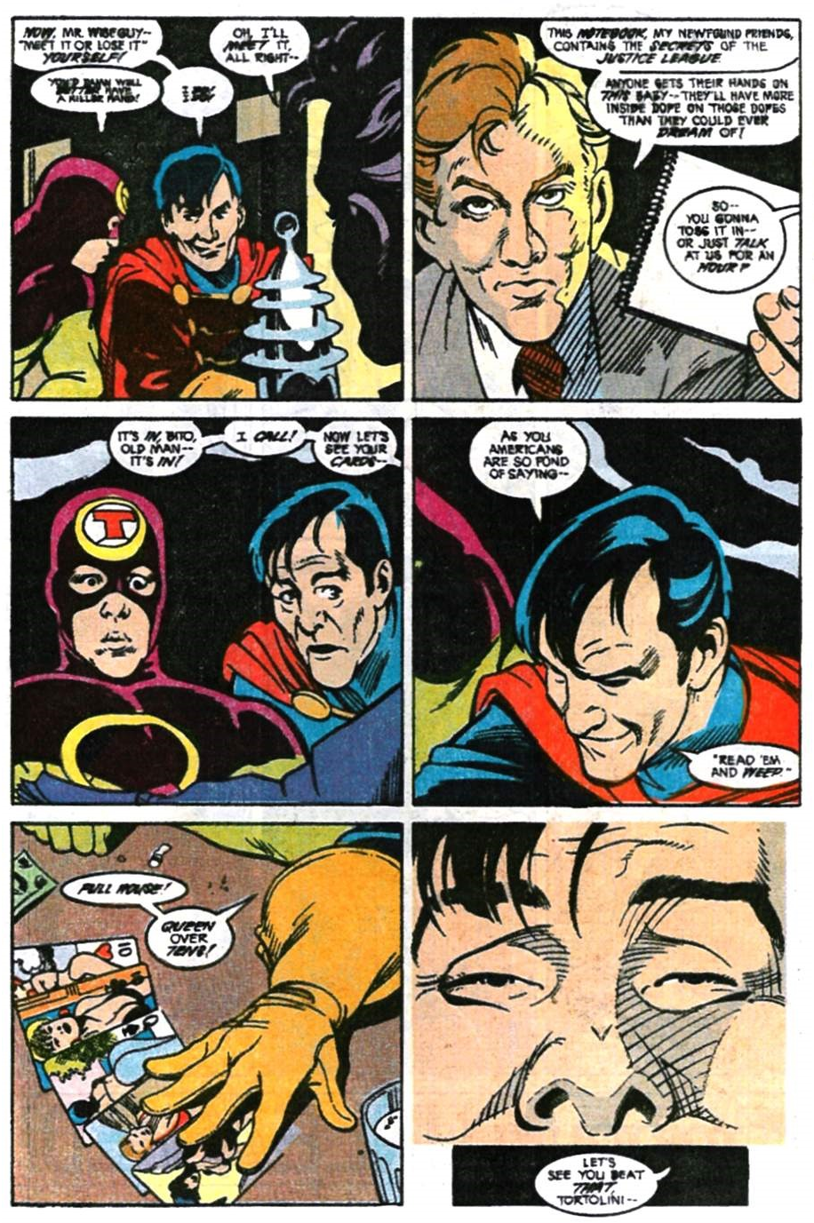 This story arc begins with a “heroic” Justice League associate using wealth and power to crush a reporter researching the truth about the team. You probably think I’m talking about Max Lord, right?
