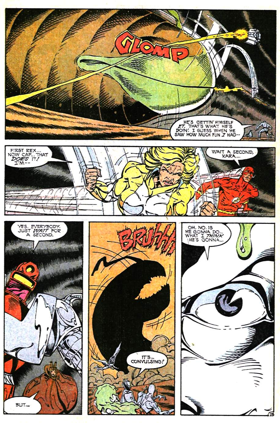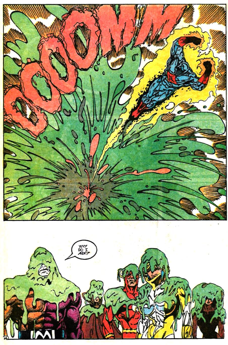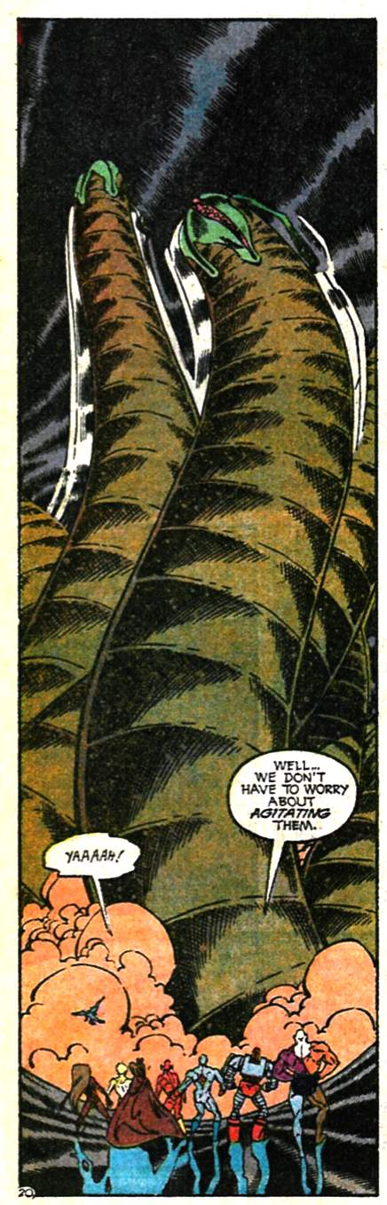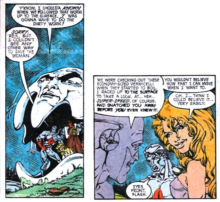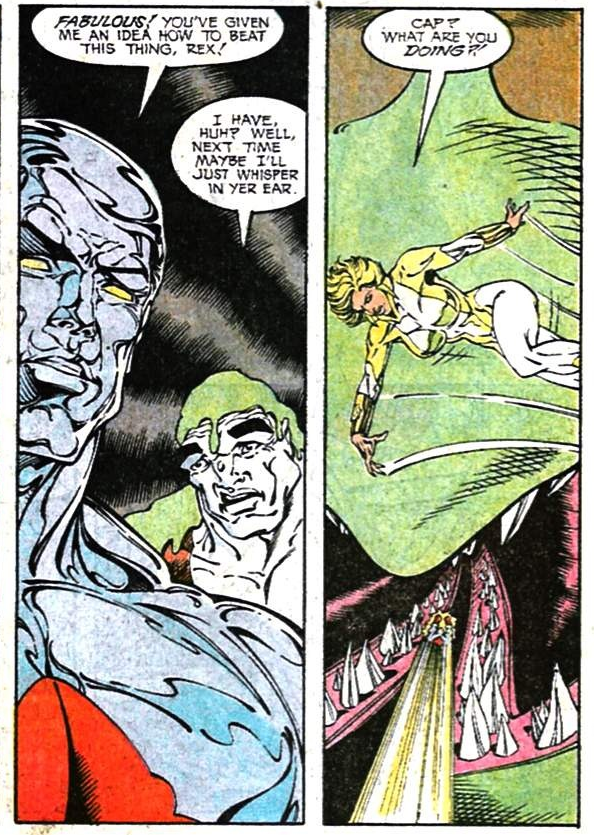 Cap and the others engage one worm in combat, but none of their attacks on its exterior work. The only thing that does is a maneuver Captain Atom improvises, after one of the worms eats Metamorpho and finds him indigestible. 💩