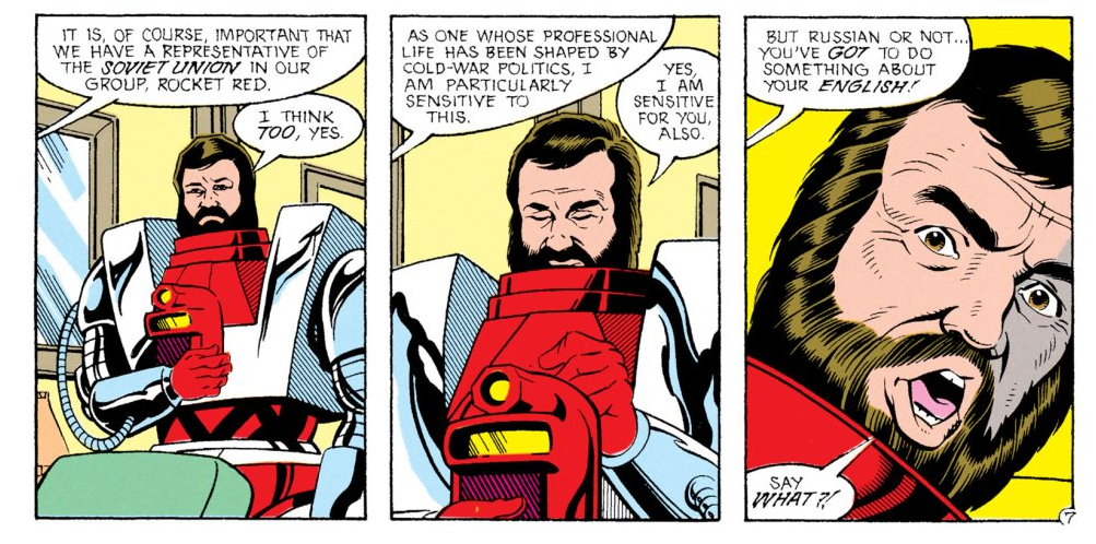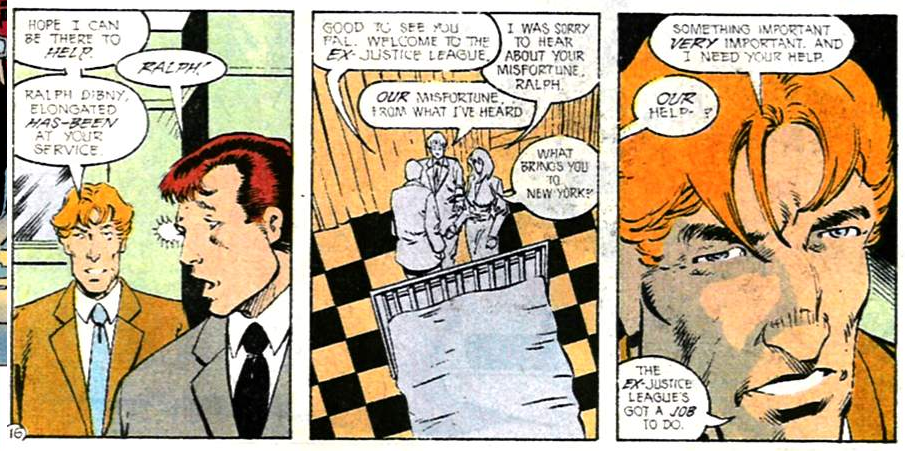 I like Ralph, but where’s the lie? Calling his power “limited” might be harsh, especially if he’s next to Bluejay or the Crimson Fox. But after all those panels of Ralph stretching around the room and invading everyone’s personal space at once, I’d say “sometimes disruptive to the group” is warranted.