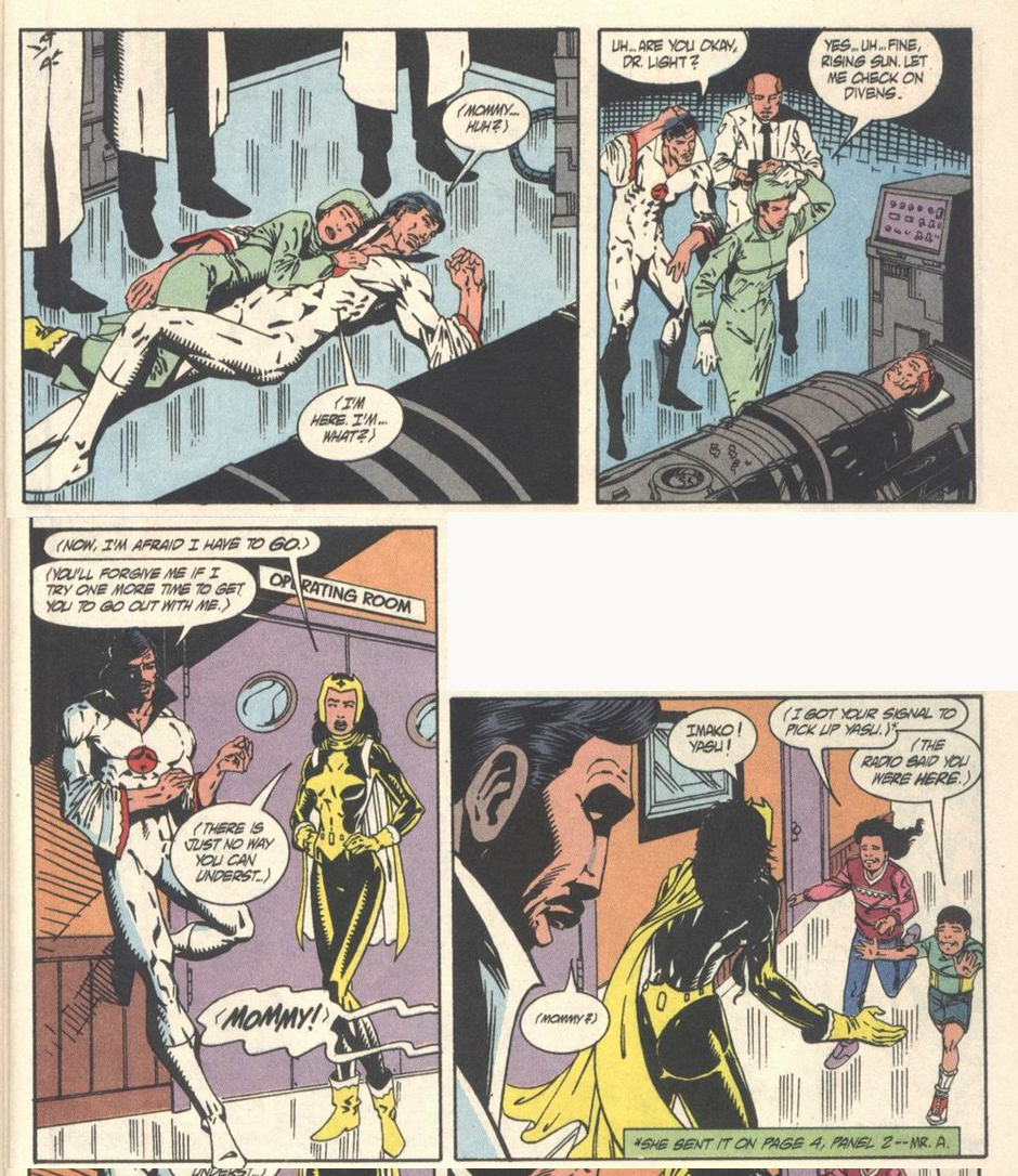 On the one hand, this story does hinge on the “annoy ’em until they give in” advice that single Nineties nerds shouldn’t have been listening to, but on the other, Isuma does deserve credit for accepting Kimiyo’s situation with such ease and grace. The ages of the kids do raise a couple of questions about Kimiyo’s personal timeline. Did she have those kids after getting her powers in the Crisis on Infinite Earths? Because she didn’t seem like the nurturing type before then (Crisis on Infinite Earths #4):