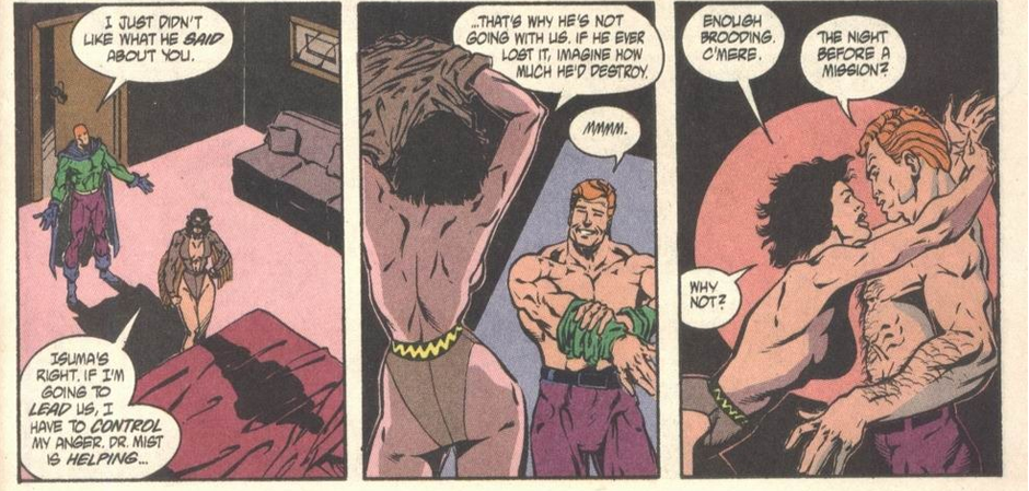 In “The REAL Return of…the Global Guardians!,” the team shown in the last frame here do some Danger Room-style training against holograms, rehearsing to fight their still-Bialyan teammates. After the training, they do some bonding.