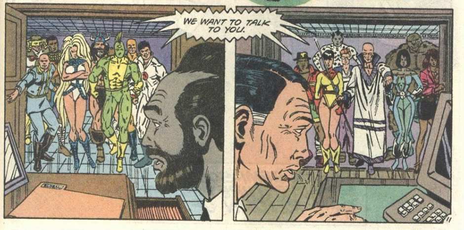Fun fact: we learned more about those last four... Cascade, Centrix, etc, in the hardcover DC Comics Encyclopedia than we ever did in the actual comics. Chrysalis? Secretly an evil robot full of killer butterflies created by a xenophobic, anti-Semitic French scientist to infect "undesirable" communities. Only he died and the robot... just kept on existing. I shit you not. Imagine creating THAT as the backstory.