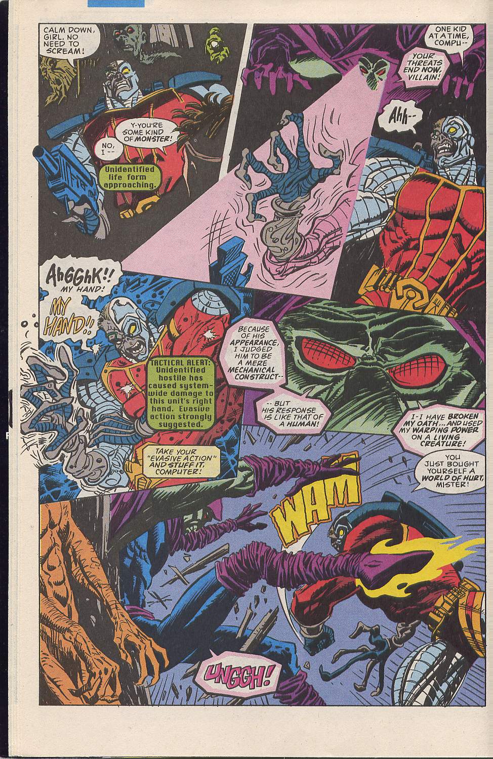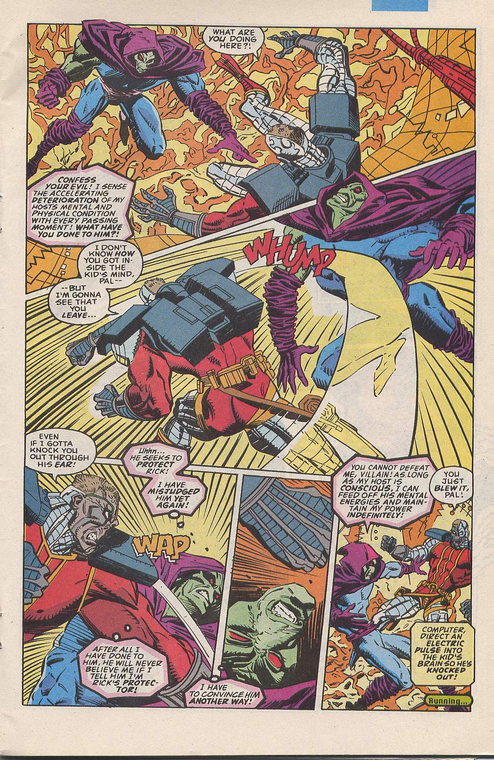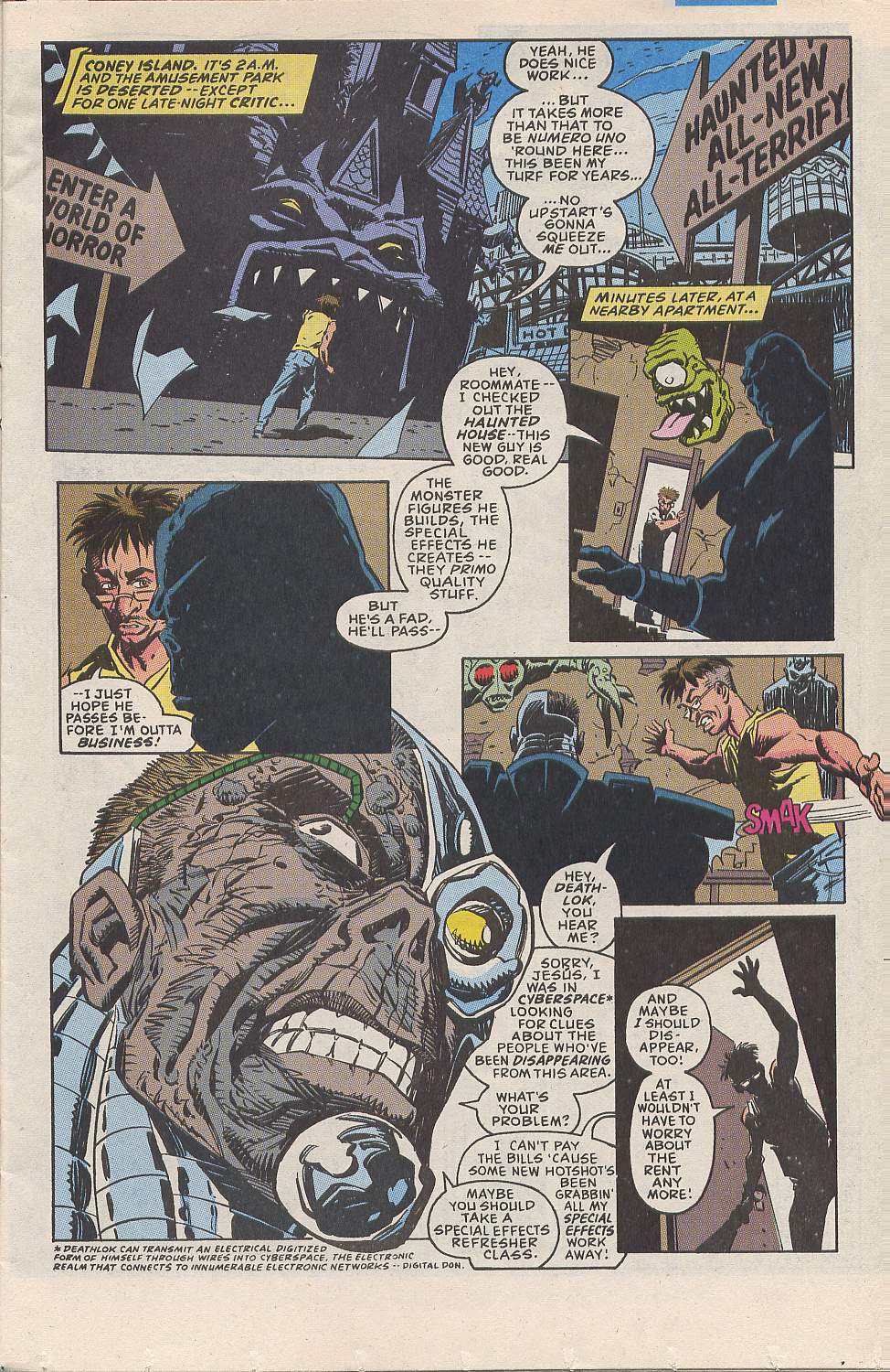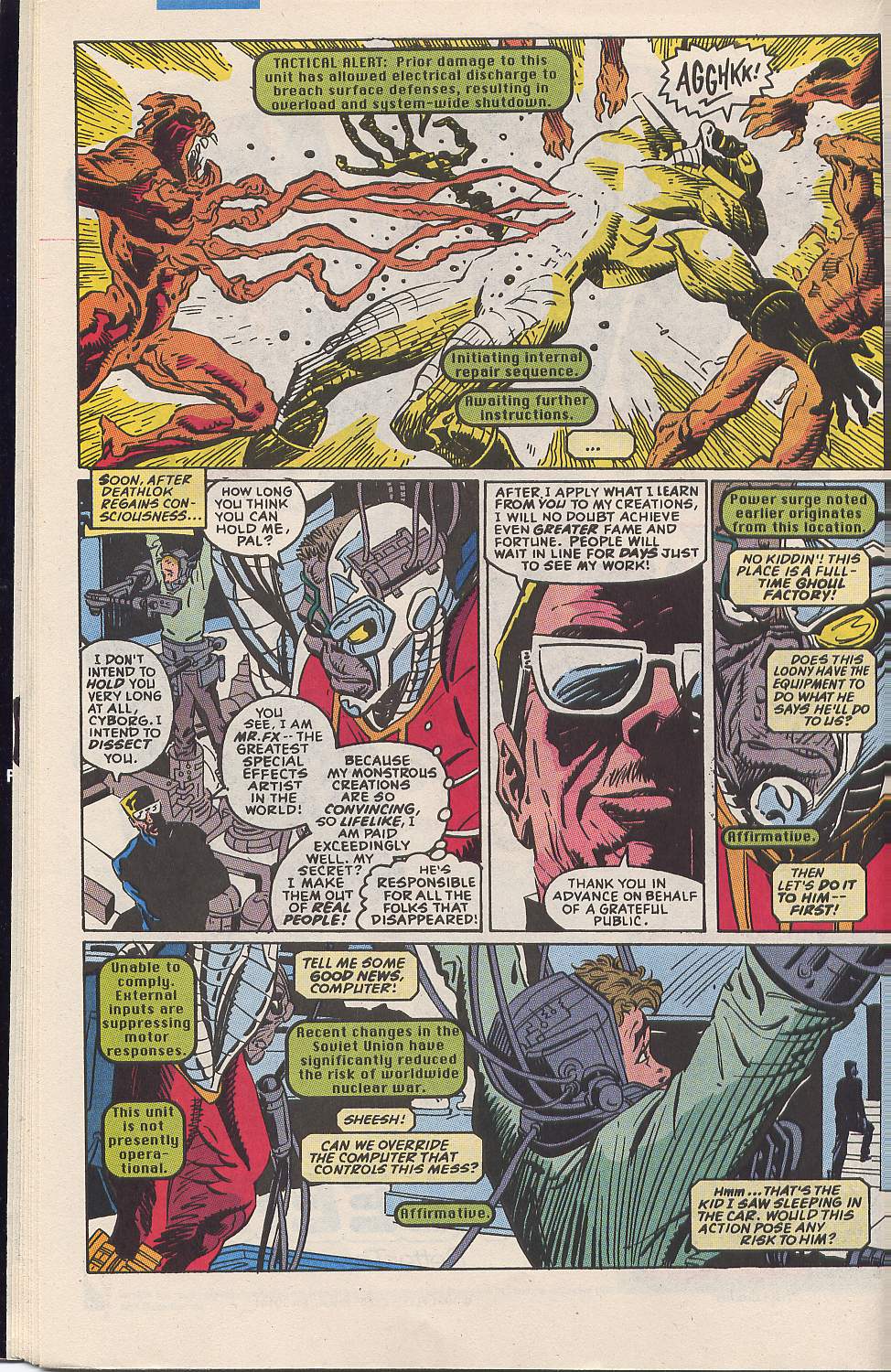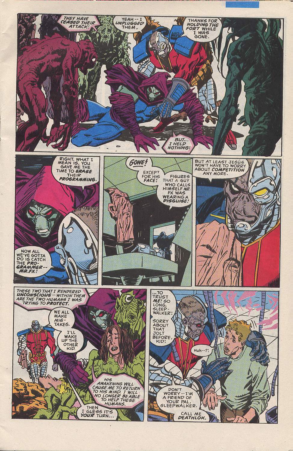 Deathlok's computer tells him that it will harm Rick thanks to network linkage, so Deathlok enters cyberspace to unlink them, entering Rick's mind, only to get attacked by Sleepwalker.